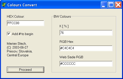 Black&White Colours Converter - Túto utilitku som napísal, kvôli príprave čierno-bielej verzie dokumentu o chránenom obrázku pre galériu vzor 5 (konkr. zachytenie a presmerovaniu príkazu Print). RGB farba je skonvertovaná na svoj ekvivalent v škále šedej použitím vzorcov CCIR Recomendation 709, ITU-R BT.709 (1990). Výsledok je zobrazený ako klasický inverse-K komponent (100% je čistá biela) modelu CMYK, RGB trojbytová hodnota a najbližšia šedá web-safe-farba - taktiež ako RGB trojbytová hodnota. Textový dokument s usporiadanými všetkými web-safe-colours farbami aich ekvivalentami v škále šedej je dodaný ku zdrojovému kódu aplikácie.